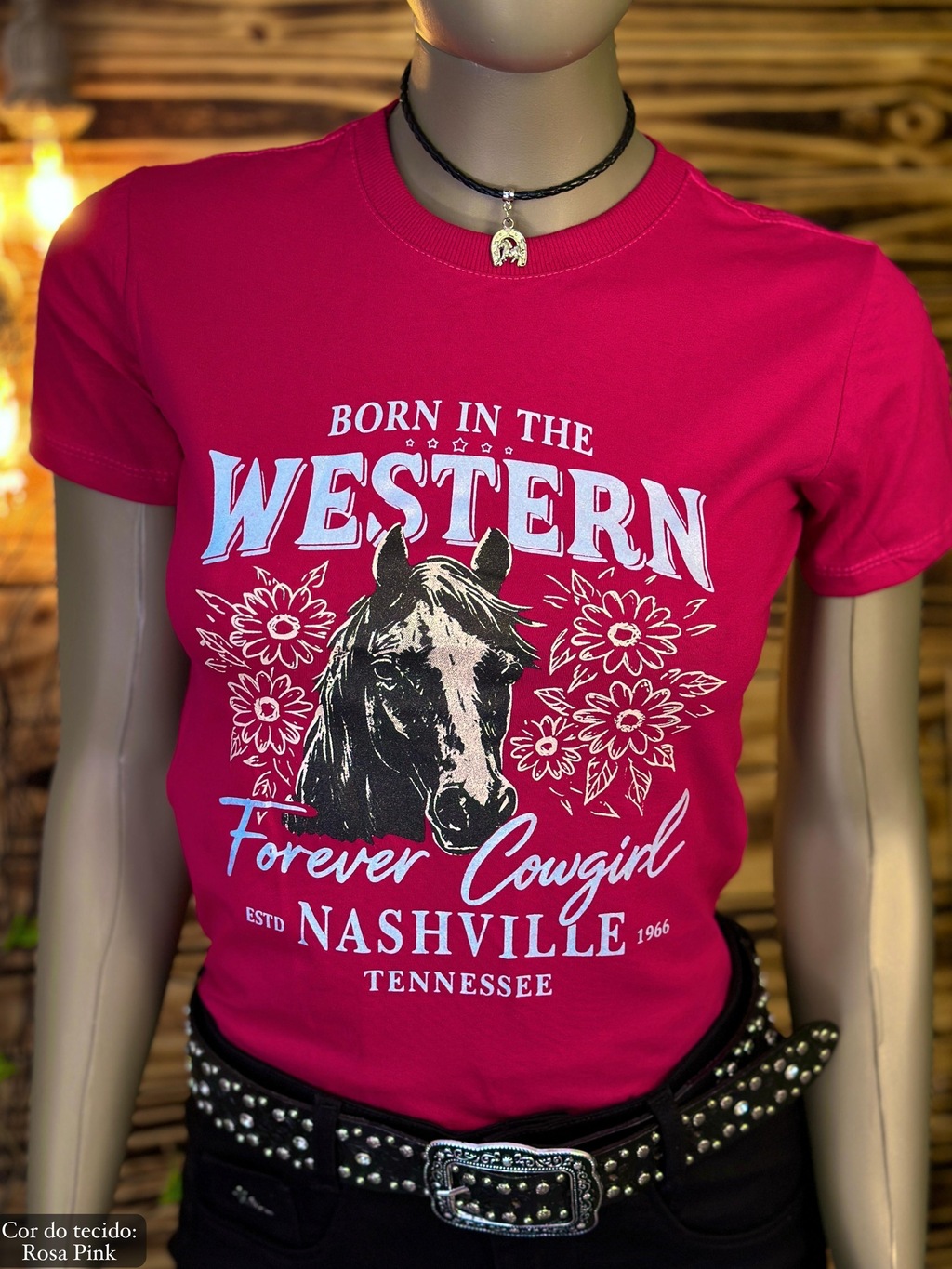 Eleve seu estilo com a T-shirt feminina Western, feita em 100% algodão fio 30.1 para um toque suave e confortável. Disponível do P ao GG, essa camiseta exibe uma estampa em silk que traz a essência do estilo country.